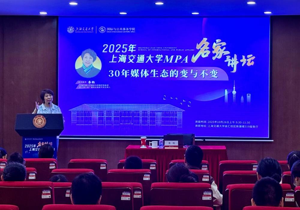 近日,上海交通大学媒体与传播学院教授、原上海人民广播电台首席节目主持人秦畅应邀出席2025年上海交通大学MPA名家讲坛活动,以“30年媒体生态的变与不变”为主题,带来一场深刻而精彩的分享。国际与公共事务学院党委书记沈丽丹、副院长刘帮成出席本次活动。